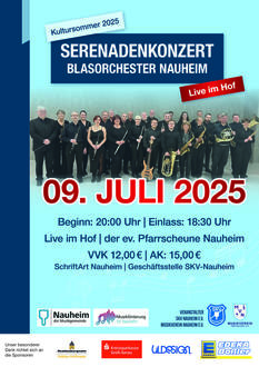 Am Mittwoch, den 09.07.2025, lädt das Blasorchester Nauheim gemeinsam mit der evangelischen Kirche Nauheim herzlich zum traditionellen Serenadenkonzert ein. Die Veranstaltung beginnt um 20:00 Uhr (Einlass: 18:30 Uhr) im idyllischen Pfarrgarten der evangelischen Kirche, Pfarrgasse 13, 64569 Nauheim.