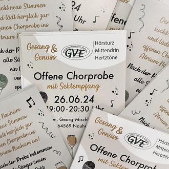 Offene Chorprobe mit Sektempfang am 26.06.2024 von 19:00 - 20:30 Uhr Der GVE Nauheim sucht neue Stimmen für seine drei Chöre "Hörsturz" (gemischter Chor), "Mittendrin" (Frauenchor) und "Hertztöne" (gemischter Chor) und lädt herzlich zur offenen Chorprobe ins Atrium Nauheim ein! Nach der Probe bekommen alle Sänger:innen ein Glas Sekt von Nero's spendiert. Mehr Infos unter www.gveintracht-nauheim.de und www.chor-hoersturz.de