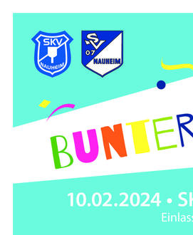 SKV Nauheim e. V. und SV 07 Nauheim e. V. laden am 10.02.2024 (Beginn: 19.11 Uhr, Einlass: 18.11 Uhr) zum Bunten Abend in die SKV-Halle ein.