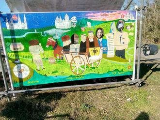 Wer hat Platz? Es kann, wie im Moment, auf Gerüst, mit Überdach, sturmfest gestellt werden, oder aber Wandmontage? Dort, wo bisher Köpfe durchgesteckt werden konnten für Selfies, könnten Spiegel rein, damit auch weiterhin beim alljährlichen Wettbewerb ein Candlelight-Dinner gewonnen werden kann: wer die meisten richtigen Details im Bild auflistet, darf mit dem Maler fürstlich speisen in www.rheinschanze-maaraue.de
