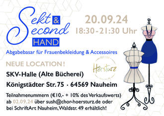 Zum ersten Mal findet unser beliebter „Sekt & Second Hand – Abgabebasar für Frauenkleidung und Accessoires“ in der "Alten Bücherei" der SKV-Halle in Nauheim statt.