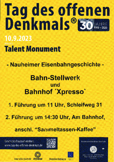 Das bundesweite Motto des Tages des offenen Denkmals "Talent Monument" am 10. September 2023 wird auch vom Heimat- und Museumsverein Nauheim umgesetzt. Anschauungsobjekte sind das Stellwerk der Bahn aus dem Jahre 1932 und der Bahnhof, der nun 140 Jahre steht — beide denkmalgeschützt!