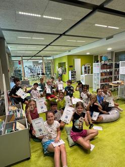 Der 4. Tag verband wieder Bewegung und kognitive Herausforderungen. Treffpunkt war die Georg-Schad-Halle. Nachdem das Ferienspiellied mit bester „Hallenakustik“ gesungen war, konnte eine Gruppe in der Halle bleiben. Die andere ging in die Bücherei. Dort wartete das Umweltrallye-Team; Frau Foit als Leiterin der Bücherei, Jeannine Dickopf, im freiwilligen sozialen Jahr und Anna Wiederspahn, Teamerin bei der Kinder- und Jugendförderung, mit kniffligen Fragen rund um Abfallentsorgung, Bedeutung und Umgang mit Wasser sowie Insektenschutz. Den Kindern wurde ein Bilderbuch-Kino präsentiert, sie mussten Fragen mithilfe von Büchern beantworten, konnten am PC ihre Kenntnisse testen und Umweltplakate nach ihren Ideen erstellen. Für ihre rege Teilnahme und ihre Mühe erhielten sie eine Urkunde und eine Medaille aus einer Holzscheibe.