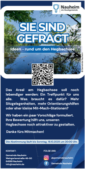 Das zuständige Projektteam der Gemeinde Nauheim ist gespannt auf die Ergebnisse. Auch Bürgermeister Marc Friedrich freut sich auf altersübergreifende, neue Angebote: „Diese Umfrage wird zeigen, ob zum Beispiel mehr Sitzgelegenheiten oder eher eine kleine Mit-Mach-Station gefragt sind. Die Bewertung hilft uns auf jeden Fall, die Umgebung des Hegbachsees noch attraktiver für alle Generationen zu machen.“