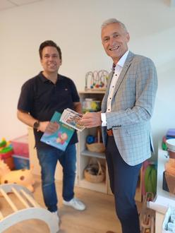 Bürgermeister Marc Friedrich und Lucian Lazar, Leiter Regionales Diakonisches Werk Groß-Gerau/Rüsselsheim bei der Eröffnung des Stützpunkts „TagesKids“ in Nauheim (© Gemeinde Nauheim)