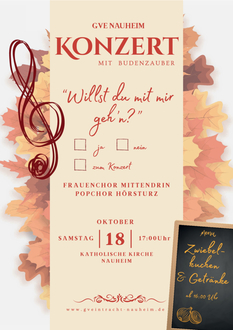 Der Frauenchor Mittendrin lädt am 18.10.2025 zum Konzert unter dem Titel „Willst du mit mir geh’n?“ im Rahmen des Herbst-Budenzaubers ein. Das erste gemeinsame Konzert unter der Leitung von Mona Dornbusch, die auch den Frauenchor des GVE im Frühjahr mit spürbar frischem Wind übernommen hat, verspricht einen musikalisch abwechslungsreichen Nachmittag.