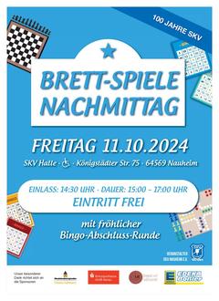 Zum Brettspielnachmittag lädt die SKV Nauheim am 11.10.2024 von 15.00 bis 17.00 Uhr (Einlass: 14.30 Uhr) in die barrierefreie SKV-Halle, Königstädter Str. 75, 64569 Nauheim, ein. Der Eintritt ist frei.