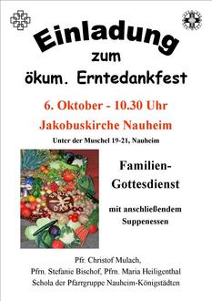 | 10.30 Uhr | ökum. Gottesdienst, gemeinsam mit den Königstädter Kirchengemeinden in der katholischen Kirche in Nauheim, anschl. gemeinsames Mittagessen |