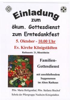 | 10:00 Uhr | Ökumenischer Erntedankgottesdienst in der Evangelischen Kirche in Königstädten mit anschließendem Suppe essen. |