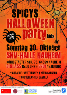 Die Spicys laden in diesem Jahr wieder Mal zu einer Halloweenparty für Kids in die SKV Halle nach Nauheim ein. Neben Musik und allerlei gruseligen Leckereien, stehen viele tolle Aktivitäten bereit. Beim Kürbiskegeln besteht das Ziel darin, so viele Skelette wie möglich abzuräumen. Beim Augapfel-Wettrennen muss vor allem eine ruhige Hand bewahrt werden, an der Tattoo Station bekommt jedes Kostüm noch den letzten Schliff und beim Grablichter basteln können die Kids kreativ werden. Eine Verkleidung ist für Groß und Klein erwünscht. Los geht es am Samstag, den 30. Oktober. Einlass ist um 15:00 Uhr, Ende um 18:00 Uhr. Der Eintritt beträgt 3,50 € pro Person. Die Spicys freuen sich über viele gruselige Gesichter."