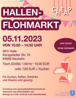 Am 05.11.2023 findet von 10.00 Uhr bis 14.30 Uhr ein Hallenflohmarkt in der SKV-Halle statt. Als Verkäufer sind nur Privatpersonen zugelassen. Es wird ein vielfältiges Angebot geben. Für das leibliche Wohl ist mit Würstchen, selbstgebackenen Kuchen, Waffeln sowie Getränken gesorgt.Tischreservierungen nimmt die Geschäftsstelle (geschaeftsstelle@skvnauheim.de oder 06152-6383611) entgegen.