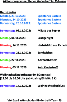 Ab dem 02.11.2023 startet dann auch das Aktionsprogramm im Kindertreff. Einmal pro Woche findet ein geplantes Angebot statt. Jeweils im Wechsel an einem der drei Wochentagen.