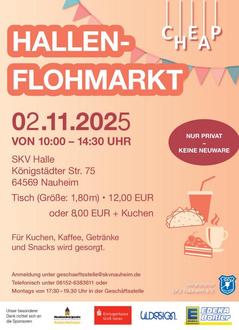 Am Sonntag, den 02.11.2025, lädt die SKV Nauheim wieder herzlich zum beliebten Hallenflohmarkt ein. Von 10:00 Uhr bis 14:30 Uhr können Besucher in der SKV-Halle (Königstädter Straße 75, 64569 Nauheim) nach Herzenslust stöbern, feilschen und vielleicht das ein oder andere Schätzchen entdecken.