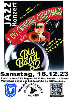 Anschließend lassen Sie sich vom Projekt "Swinging Christmas" der Big Band `82 überraschen, das von Sängerin Astrid Nowotny begleitet und mit weihnachtlich-besinnlichen Geschichten, vorgetragen von Ini Gerharth, bereichert wird. Das alles unter der Leitung von Rainer Heute (HR BigBand).