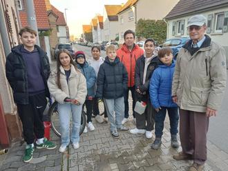 Reinigung der Stolpersteine durch das Kinder- und Jugendparlament (KiJuPa) unter Mitwirkung von Hans Joachim Brugger (Heimat- und Museumsverein Nauheim) und in Begleitung von Bürgermeister Marc Friedrich.