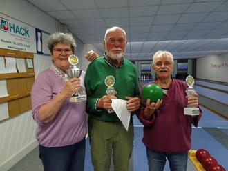 Die Gewinner des Kegelturniers sind Ursula Böhm und Heinz Pitzer, dazwischen Wanderwart Wolfgang Meinke.