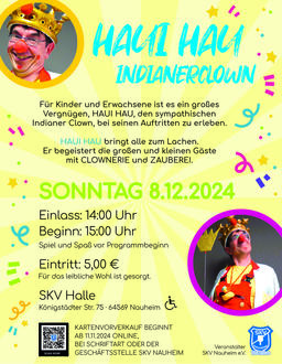 Indianer Clown HAUI HAU kommt am 08.12.2024 in die barrierefreie SKV-Halle. Für Kinder und Erwachsene ist es ein großes Vergnügen, HAUI HAU, den sympathischen Indianer Clown, bei seinen Auftritten zu erleben. HAUI bringt alle zum Lachen und bietet ein buntes Programm für Kinder. Es ist eine Kombination aus Zauberei und Clownerie. Einlass ist um 14.00 Uhr und um 15.00 Uhr beginnt die Show. Vor Veranstaltungsbeginn ist für Spiel und Spaß und das leibliche Wohl gesorgt. Karten sind erhältlich bei SchriftArt Nauheim, Geschäftsstelle SKV Nauheim (montags 17.30 – 19.30 Uhr) und online unter https://skvnauheim.vereinsticket.de. Weitere Informationen unter http://www.skvnauheim.de.