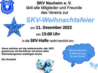 Am 11.12.2022 findet um 15.00 Uhr die Weihnachtsfeier der SKV Nauheim statt. Alle Mitglieder und Freunde sind herzlich eingeladen, gemeinsam mit einem tollen Rahmenprogramm das Jahr ausklingen zu lassen.