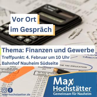 Am Samstag, den 04.02.2023 lädt Bürgermeisterkandidat Max Hochstätter von 10.00 bis 12.00 Uhr zum Thema „Finanzen und Gewerbe“ am Bahnhof (Südseite) ein. Das Gewerbe ist ein wichtiger Baustein, damit Nauheim auch langfristig attraktiv bleibt. Die Betriebe vor Ort schaffen Arbeits- und Ausbildungsplätze, beleben den Ort und tragen wesentlich zur finanziellen Gesundheit der Gemeinde bei. „Eine langfristig angelegte Gewerbepolitik ist eine wichtige Voraussetzung für die Entlastung der Bürger. Unser Ziel muss es sein, die Grundsteuer B in Nauheim zu normalisieren, das geht nur mit einem starken Gewerbe“, so Max Hochstätter. Über den direkten Austausch zu diesen (und anderen) Themen mit den Bürgern/innen freut sich Max Hochstätter.