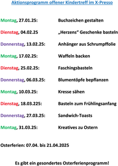 Ab dem 27.01.2025 bietet das Kindertreff-Team jede Woche einen festen Programmpunkt, im Wechsel des Wochentages, an. Eine Anmeldung ist nicht notwendig. Ansonsten wird der Name des Kindes/der Kinder und die Nummer einer Kontaktperson, die zu den Öffnungszeiten erreichbar ist, benötigt.