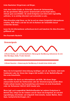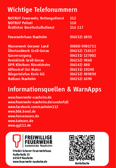 In der Broschüre "Informationen und Notfalltreffpunkte im Katastropenfall" hat die Freiwillige Feuerwehr Nauheim wichtige Adressen und Tipps für sogenannte Sonderfall-Situationen wie Unwetter, Stromausfälle o.ä. zusammengestellt.