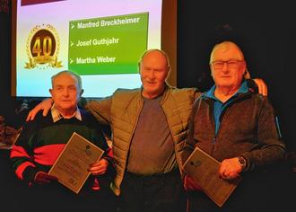In diesem Jahr konnten folgende Mitglieder geehrt werden: Für 25 Jahre Hetwig Kutschinski und Betty Stöhr. Für 40 Jahre Martha Weber sowie Manfred Breckheimer und Josef Guthjahr. Die beiden Letztgenannte konnten die Urkunden persönlich entgegennehmen.
