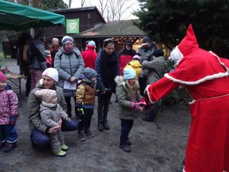 Durch das Singen aus vielen Kehlen ließ der Nikolaus nicht lange auf sich warten. Kleine und große Kinder kamen der Aufforderung fix nach, als der Nikolaus nach einem Gedicht oder Lied fragte. Zur Belohnung bekamen sie eine gut gefüllte Tüte mit allerlei Leckerem, einer weihnachtlichen Aufziehfigur, einem Kinderstempel und zu guter Letzt noch Seifenblasen, die gleich ausprobiert wurden.