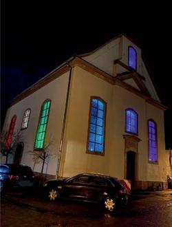 Seit dem 27. Januar strahlt unsere evangelische Kirche am Heinrich-Kaul-Platz in bunten Farben in den dunklen Abendstunden. Als Zeichen der Hoffnung, des Lebens und der Freude soll die erleuchtete Kirche nicht nur ein Ort des Glaubens, sondern auch ein Symbol sein für Gemeinschaft und Hoffnung. Der Kirchenvorstand ist begeistert von der Idee, die von Flynn Stratmann und seinem Team umgesetzt wurde. So können nun alle Menschen in der Zeit vom Reformationstag bis zum Osterfest die Kirche abends in der Zeit zwischen 17.00 - 22.00 Uhr beim Spaziergang von außen bewundern und den Augenblick genießen. Zur Zeit sind die Lichter so programmiert, dass im täglichen Wechsel die Kirche einmal in lila und einmal in bunten Regenbogenfarben leuchtet. Die verwendeten LED Lampen sind extrem stromsparend.