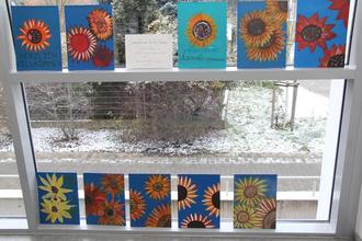 Entstanden sind die farbenfrohen Sonnenblumen-Bilder im Rahmen ihres Kunstunterrichts. Als die DIK B das Adventsfenster Nummer 16 des Rathaus-Adventskalenders in einem Büro des Erdgeschosses schmückte, brachten sie auch ihre gemalten Friedensgrüße für das Treppenhaus mit.