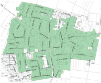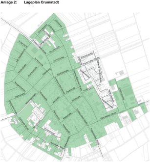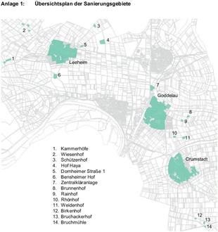 In den gemäß Anlagen zu dieser Satzung definierten Gebieten haben sich mit der Zeit städtebauliche Missstände entwickelt. Diese Bereiche sollen durch städtebauliche Sanierungsmaßnahmen verbessert und umgestaltet werden. Das Gebiet wird hiermit als Sanierungsgebiet förmlich festgelegt. Das Sanierungsgebiet umfasst alle Grundstücke und Grundstücksteile innerhalb der in den Lageplänen (Übersichtsplan sowie Pläne der Stadtteile Crumstadt, Goddelau und Leeheim) benannten Flächen. Diese Lagepläne und die Listen der Flurstücke (Anlagen) sind Bestandteil der Satzung.