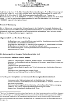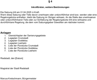 Aufgrund der §§ 5 und 51 Nr. 6 der Hessischen Gemeindeordnung i. d. F. der Bekanntmachung vom 07.03.2005 (GVBl. I S. 142), zuletzt geändert durch Artikel 2 des Gesetzes vom 16. Februar 2023 (GVBl. S. 90, 93) und der §§ 136 ff. des Baugesetzbuches (BauGB) in der Fassung der Bekanntmachung vom 23.09.2004 (BGBI. I S. 2014), zuletzt geändert durch Gesetz vom 20.12.2023 (BGBl. I S. 394) hat die Stadtverordnetenversammlung der Stadt Riedstadt in ihrer Sitzung am 13.03.2025 folgende Satzung beschlossen: