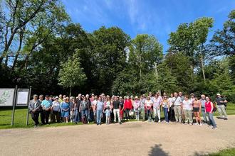 Die Teilnehmerinnen und Teilnehmer des Ausflugs am Eingang zum Park Wilhelmsbad in Hanau
