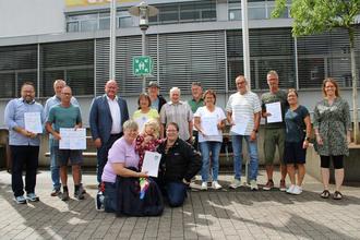 Die Riedstädter Gewinner des Stadtradelns mit Bürgermeister Marcus Kretschmann (4.v.li.) und Koordinatorin Sandra Seum (rechts).