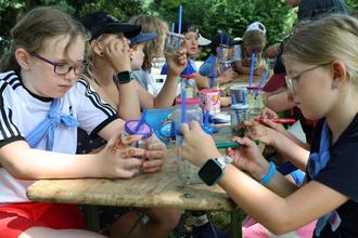 Im Jugendhaus trocknen etliche bunt gebatikte T-Shirts, draußen bastelt die blaue Gruppe mit ihren Betreuenden Dominik und Mia gerade aus Marmeladengläsern und je zwei blauen Strohhalmen Insektensauger. Emilia und Melissa (beide neun Jahre) zeigen, wie es funktioniert: Ein Insekt wird mit Hilfe des einen Strohhalms durch die Öffnung des zweiten Halms angesaugt. Ein Filter verhindert, dass das Insekt in den Mund geraten kann. Melissa hat auf diese Weise eine Fliege gefangen, die sie nun in Ruhe im Glas betrachten kann, bevor sie sie wieder freilässt.