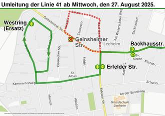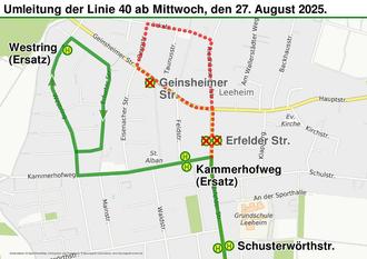 Für die Linie 40 entfällt zusätzlich die Haltestelle “Erfelder Straße“. Die Lokale Nahverkehrsgesellschaft Kreis Groß-Gerau (LNVG) bittet die Fahrgäste, auf die Ersatzhaltestellen im Kammerhofweg nahe der Feldstraße und im Westring nahe der Erfurter Straße auszuweichen.