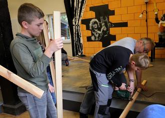 Schon am Eingang des Jugendhauses Goddelau ist rhythmisches Sägen zu hören, der Geruch von Sägespäne liegt in der Luft. Das große Podium im Saal des Jugendhauses dient jungen Kunst-Handwerkern als praktische Arbeitsbühne. Vier Mädchen und fünf Jungs sind emsig damit beschäftigt, mit Winkel, Lineal und Bleistift die richtigen Maße auf Holzbretter zu zeichnen und mit der Handsäge auf die richtige Länge zu bringen.