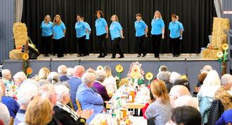 Einen vergnüglichen Nachmittag erlebten Seniorinnen und Senioren der Büchnerstadt Riedstadt in der Heinrich-Bonn-Halle in Leeheim. In diesem Jahr umsorgten Mitglieder Wolfskehler Vereine die Gäste und bestritten den größten Teil des Bühnenprogramms. Die Naturkita und die Kita Kinderinsel aus Wolfskehlen hatten für die liebevolle Tischdekoration gesorgt. Hierbei verzauberten insbesondere die aus Kiefernzapfen und Federn gebastelten kleinen Vögel.