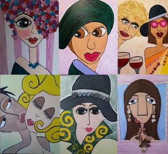 Gezeigt werden knallbunte Frauenköpfe, die mit ihren großen Kulleraugen und vollen Lippen Lebensfreude ausstrahlen. Die Künstlerin sagt dazu: „Meine Bilder sind bunt, schräg und ich liebe sie.“