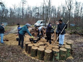 Eichenstämme wurden in Erdlöcher gerollt, mit Holzspänen und Hackschnitzeln aus Eiche aufgefüllt und festgeklopft, damit die zukünftigen Bewohner ausreichend Nahrung haben. An zwei Standorten im Wald wurden sogenannte Hirschkäferwiegen angelegt: An der Ecke Eichenrainweg/Stockstraße in Rüsselsheim sowie zwischen den beiden Wildschweingehegen in Raunheim. Hirschkäferwiegen sind spezielle Brutstätten für die Larven, die den Großteil ihres Lebens unter der Erde verbringen. Alt- und Totholz sind dabei für ihre Entwicklung essenziell.