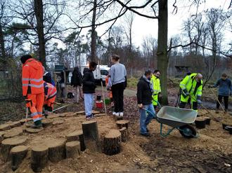 Bereits zum Wochenbeginn hatten die Auszubildenden der Abteilung Grünpflege des Städteservice unter der Anleitung von Thomas Voß die Erdlöcher für die beiden Hirschkäferwiegen vorbereitet und einige der massiven Eichenstämme in die vorbereiteten Löcher platziert. Auch für die Azubis war dies ein besonders herausragendes Projekt, an dem sie gerne teilgenommen haben.