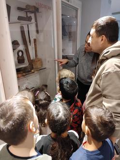 Die Kinder sind fasziniert von den alten Werkzeugen.