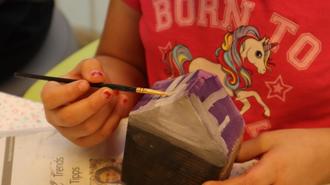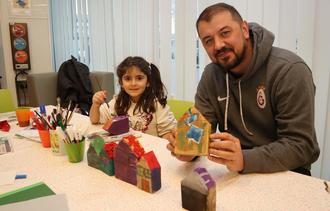 Wasserfarben, Pinsel, Stifte und farbige Bastelpappe lagen im Dezember auf den Werktischen in der Mediathek bereit. Und das Wichtigste: Häuser aus Holzklötzen, die Mediatheksleiterin Beate Remané selbst vorbereitet hatte. Kinder tunkten Pinsel in die Wasserfarben und bemalten damit die Häuserfassaden, schnitten aus Pappe bunte Fenster aus und klebten diese auf das Holz. Auf diese Weise entstanden beim Adventsbasteln viele schöne bunte Häuser.