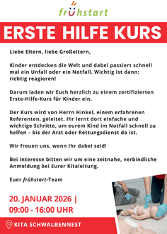 In Kooperation mit der Initiative frühstart lädt die Stadt Raunheim Eltern, Großeltern und andere Bezugspersonen zu einem zertifizierten Erste-Hilfe-Kurs ein. Der erfahrene Referent Jens M. Hinkel zeigt einfache und wichtige Schritte, um dem Kind im Notfall schnell zu helfen – bis Arzt, Ärztin oder Rettungsdienst da ist.