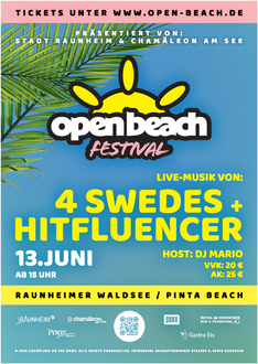 Erleben Sie einen Tag am See mit toller Musik, guter Laune und jeder Menge Beach Vibes. Jetzt schnell Tickets sichern! Kartenvorverkauf im Bürgerbüro der Stadt Raunheim zu den Öffnungszeiten oder online unter https://www.open-beach.de/.