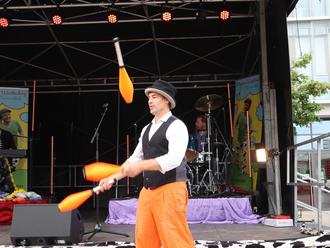 Maxim Wartenberg und sein Team sorgten für einen lustigen, unterhaltsamen und ausgelassenen Nachmittag. Los ging es mit Stelzenmann Daniel Lorenz, der Jung und Alt mit seinen riesigen Beinen immer wieder zum Lachen brachte. In einer kleinen Manege gab es viel zum Ausprobieren. Diavolos, Hula-Hoop-Reifen, Balance-Bord, Jonglierteller, Slackline und vieles mehr – beim Mitmachzirkus à la Cirque du Soleil war für jeden eine kleine Herausforderung dabei.