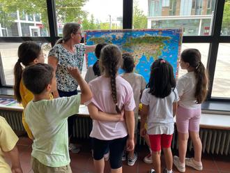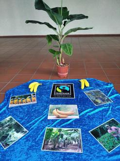 Mit einem Maßband und einer bunten Weltkarte wurde staunend festgestellt, dass zwischen Deutschland und Ecuador, einem der Hauptanbaugebiete für Bananen, eine Strecke von 6.000 Kilometern liegt. Die Kinder durften rätseln, wie denn Bananen zu uns in den Supermarkt kommen und mit Bildern die Produktionskette vom Anbau bis zum Weg zu uns in den Supermarkt verfolgen. Auch fanden sie es unfair, dass die Bäuerinnen und Bauern so wenig Geld für ihre anstrengende Arbeit erhalten.