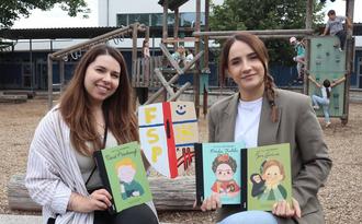 Sumeja Husovic (links) und Arzu Keles mit den drei Büchern über Attenborough, Kahlo und Goodall.