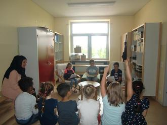 Jeden Donnerstag ging Sultan Ardic mit sechs bis acht Kindern in der dritten Schulstunde in die Klasse von Ellen Bauer. Zwei bis drei Viertklässler sind mit dem Kita-Besuch in einen Nebenraum gegangen und haben den Kindern vorgelesen: einfache Geschichten, Bilderbücher, Kamishibai. „Wenn die Kinder Fragen gestellt haben, sind sie darauf eingegangen“, blickte Ardic auf diese Zeit zurück.