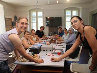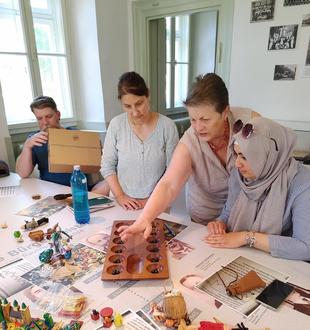 Das Jahrtausende alte Spiel Kalaha begeisterte einige Kolleginnen spontan. Elke Fleißig (Zweite von rechts) erklärt die Spielregeln.