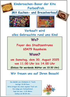 Für Samstag, 30. August, laden Team und Elternbeirat der Kita FarbenFroh Familien aus Raunheim und Umgebung von 11:00 bis 14:00 Uhr zu ihrem traditionellen Kindersachenbasar ein. Die Verkaufsfläche befindet sich im Foyer des Stadtzentrums neben der Kita FarbenFroh (gegenüber dem Rathaus). Werdende Mütter haben bereits ab 10:30 Uhr Zutritt zu den Räumlichkeiten.
